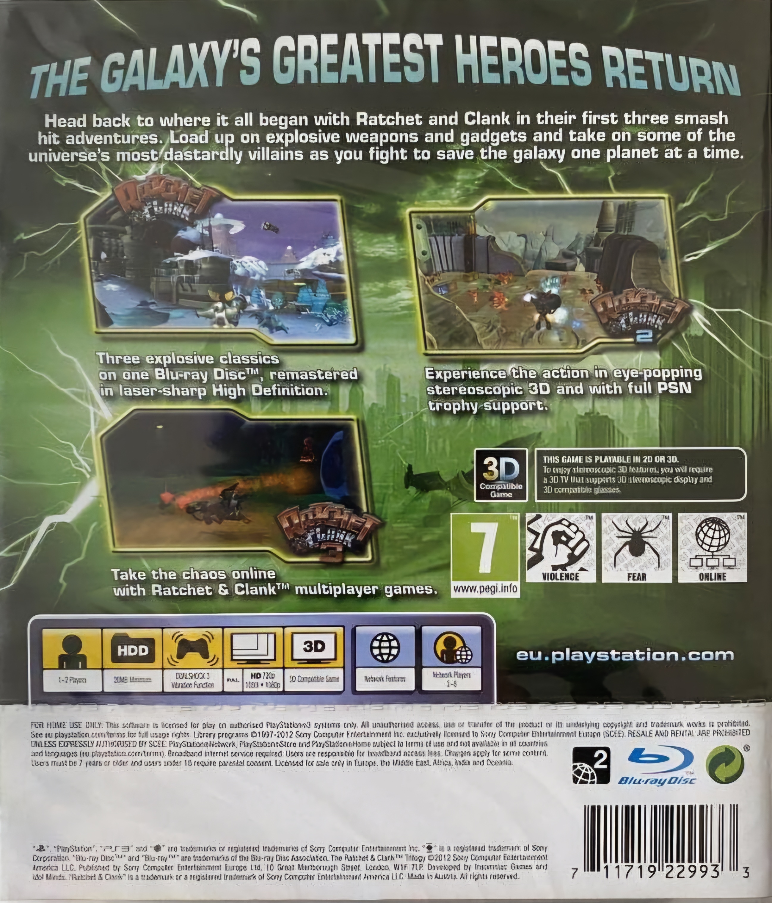 Ratchet & Clank Collection is a high-definition remastered collection. The collection includes the original 3 PlayStation 2 games: the first game, Going Commando/Locked and Loaded, and Up Your Arsenal, all at 720p in 60 frames per second, and includes stereoscopic 3D support at 30 frames per second.