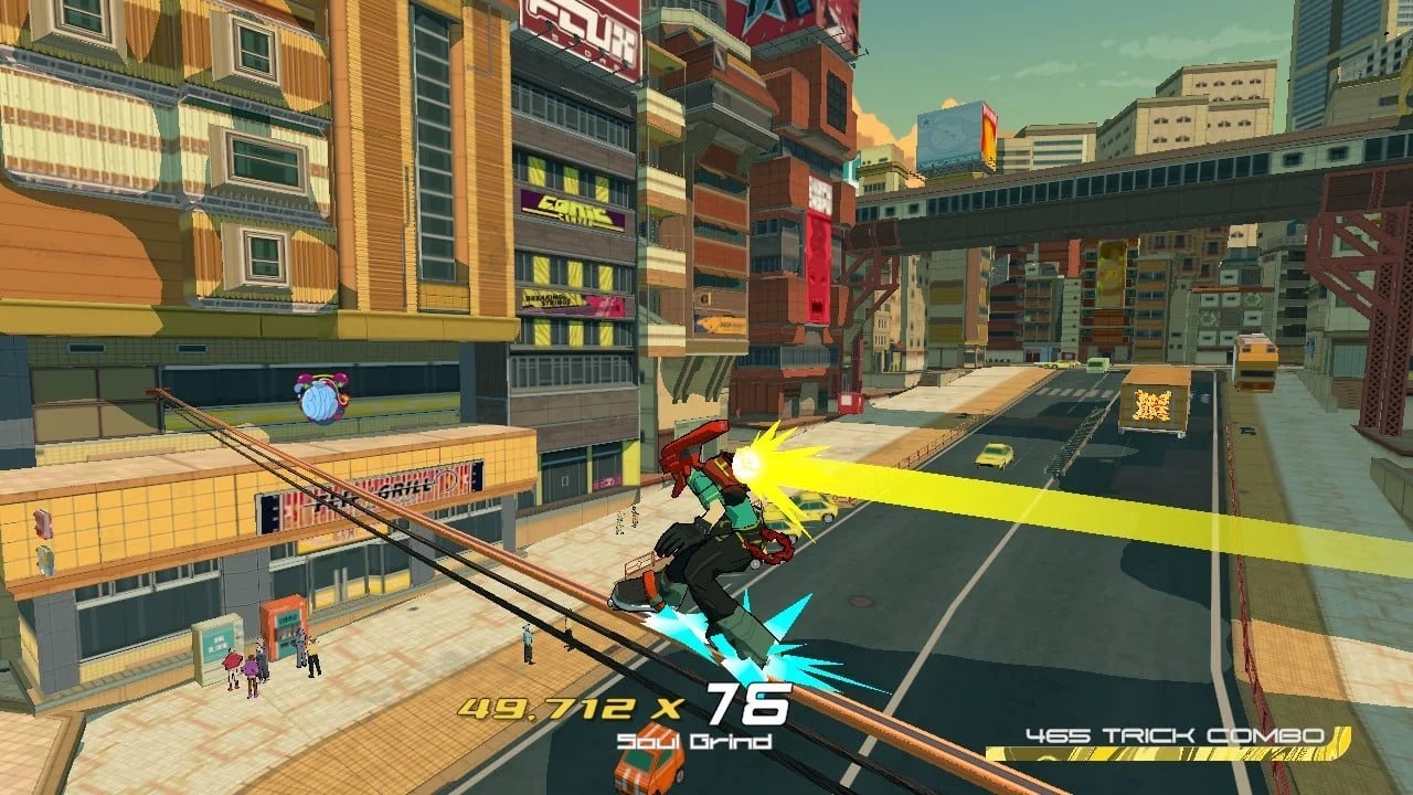 Team Reptile brings you Bomb Rush Cyberfunk, a future world from the mind of Dion Koster where self-styled graffiti crews equipped with personal boostpacks are battling each other for control of the streets. Start your own cypher and dance, paint graffiti, collect beats, combo your tricks and face off with the cops to stake your claim to the sprawling metropolis of New Amsterdam. Red is a graffiti writer who lost his head and instead uses a cyberhead to get around. In search of his roots he joins the Bomb Rush Crew, Tryce and Bel. Together they decide to go All City, to become the best graffiti crew in the city. The more territory they gain, the more they discover who it was that cut off Red's head and how deep his human side is linked to the graffiti world. Explore the 5 main boroughs of the city to hit graffiti spots and get REP. You'll need it to challenge the rival crews to a Crew Battle. Find new members to join your crew around the city. Spread around are also new graffiti pieces to paint, outfit colors and music to play on your flip phone. Use skateboarding, inline skating or BMX style tricks in the unique environment based trick system. Extend your combos with manuals and get even higher scores by incorporating special Boost Tricks. You can get boost power for doing long combos so the fastest way to move is also the most stylish. Dynamic militarized police that scales up as you vandalize.