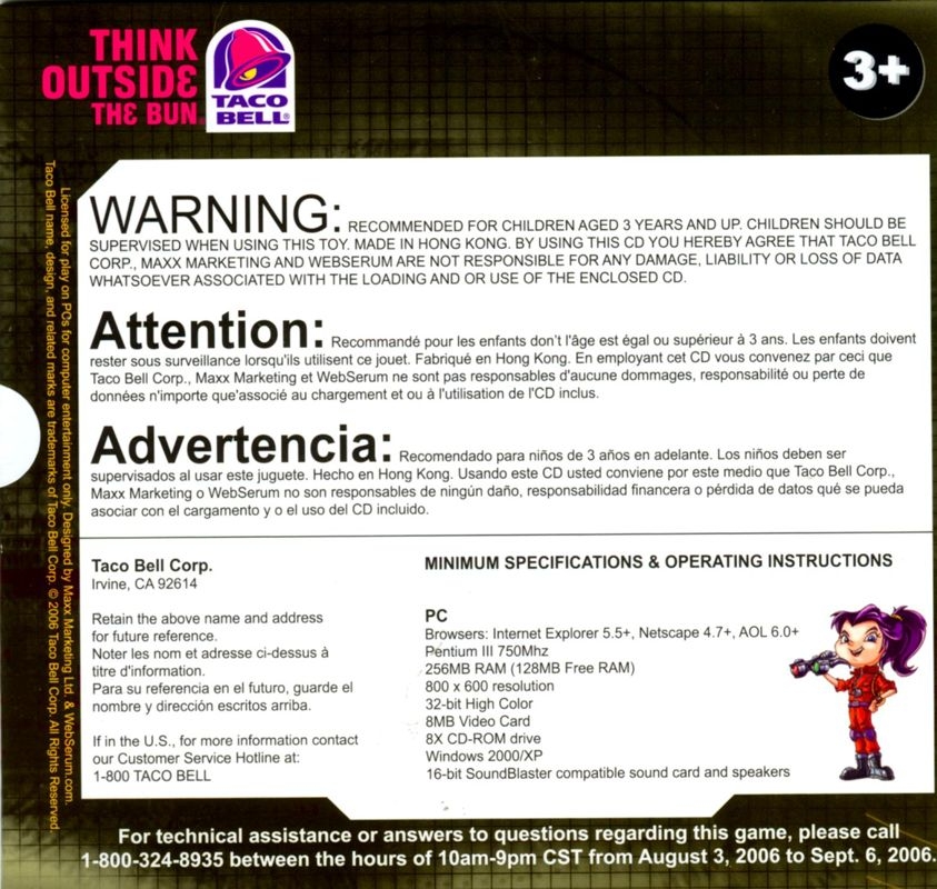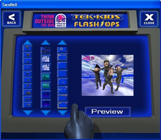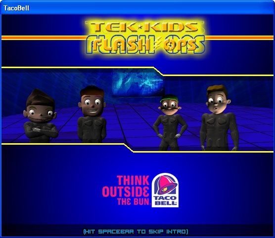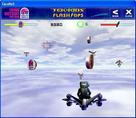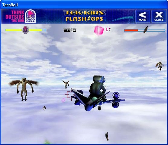 Sky Fortress is the fourth and final game in a series of promotional tie-in games for a Taco Bell campaign revolving around a Taco Bell marketing brand called Spy-Tek. The objective of this game is to take one of the four Tek Kids on a mission to thwart an evil villain named Dr. Havok who has stolen an eXperimental Aerial Aircraft Carrier, the XAA Carrier "Albatross". The player chooses from among the four Tek Kids to handle this aerial mission. The gameplay consists of piloting a small jet craft through a cloudscape while dodging enemies and collecting powerups along the way. The enemies include flying monkeys and flying masks. Powerups include 2 different types of weapons, fuel for your pod, and Taco Bell logos which restore your overall health meter. There are also warps that give your pod an incredible speed boost (but the warps do not grant invincibility, so you still need to dodge or destroy enemies). Another feature of the game allows the player to create a custom desktop wallpaper by combining various Tek Kids against backgrounds chosen from the various Flash Ops games, along with a Taco Bell "Think Outside The Bun" logo in a customizable position.