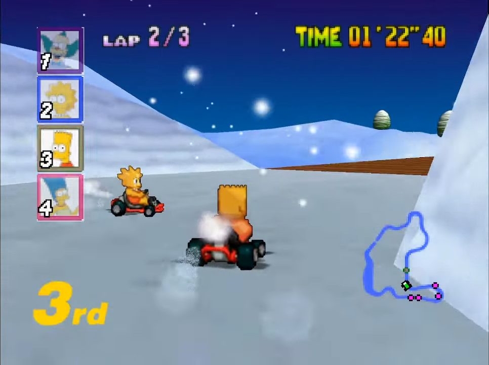 Simpson Kart 64 is a 3D racing game and a Mario Kart 64 rom hack where you play the classic Mario racing game but with characters from The Simpsons series. IN Simpson Kart 64 you have, as the main change, the game's 2D assets where the sprites of the characters and their cars are exchanged for those from The Simpsons. The 3D scenarios were not changed, nor were their music, with only the vignette at the beginning of each race being replaced by the theme from The Simpsons.