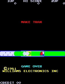 Make Trax is a 1981 arcade video game developed by Alpha Denshi and released by Williams Electronics in the USA on November 1, 1981. The player controls a paintbrush, reddish-orange in color, and must paint the entire maze in order to advance to the next stage. Two fish — one yellow, the other light blue — emerge from separate aquariums to pursue the paintbrush around the board, and if either of the fish succeeds in making contact with the paintbrush, the player loses one of three lives (four if the player has attained a certain score, generally set at 10,000 points) — after which the paintbrush disappears momentarily, then over the next approximately eight seconds is replaced by what appears to be an reddish-orange cowboy hat with an arrow shot through it, while the machine plays the chorus of the "Twelfth Street Rag," a hit song by Pee Wee Hunt in 1948. The player may use two "rollers" to attack the fish. They are located on overpasses, one vertical in its orientation, the other horizontal. To use them, the player positions the paintbrush on its forward end, waits for either or both of the fish to approach, then pushes the paintbrush along the roller, attacking the fish. The fish is removed from the maze for a few seconds, then returns to one of the aquariums and resumes its pursuit of the paintbrush. Killing fish in this manner scores bonus points. The fish initially are dumb, but as time goes on they get "smarter" learning to avoid the roller when the paintbrush nears it, and develop strategies to trap the player between them. A third character, appearing to be an animal, rolling tire, or invisible man depending on the level, may enter the maze and leave tracks that must be painted over in order for the board to be completed. The player can limit the damage by running over the figure, which not only stops further tracks from being left but also awards the player a score, which progressively increases as more boards are cleared.
