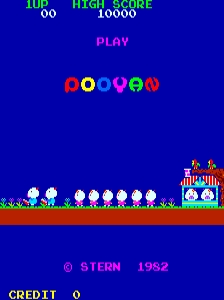 Pooyan is a 1982 arcade video game developed by Konami and released by Stern Electronics in the USA on November 1, 1982. The player controls Mama Pig, whose babies have been kidnapped by a pack of wolves and who must rescue them using a bow and arrow and slabs of meat. Controls consist of a two-position up/down joystick, which moves an elevator in which Mama Pig rides; and a button, which fires arrows and throws meat. Each level consists of two rounds. In the first, wolves descend slowly from a high ledge using balloons, which the player must shoot in order to drop them to the ground. Any wolves who reach the ground safely will climb up a set of ladders behind the elevator and try to eat Mama Pig if she moves in front of them. During the second round, the wolves start on the ground and inflate balloons in order to ascend to a cliff on which a boulder is resting so they can push it toward the edge. Airborne wolves throw rocks in both rounds, trying to hit Mama Pig. In addition, the balloon carrying the last "boss" wolf of the second round must be shot several times in order to defeat him; if he reaches the cliff, the player must defeat additional enemies before facing the boss again. A slab of meat occasionally appears at the top of the elevator's range of motion. Picking it up allows the player to throw it, distracting any wolves on/near its trajectory and causing them to let go of their balloons and crash to the ground for bonus points. Stray balloons and dropped fruits can also be shot for extra points. After every second round, a bonus screen is played. The first such screen requires the player to defeat a group of wolves using only meat, while the second awards points for shooting fruits thrown by the wolves. These two screens alternate after each level. The player loses one life if Mama Pig is hit by a rock, eaten by a wolf on the ladders (first round only), or crushed by the boulder if too many wolves reach the cliff and push it over the edge (second round only). When all lives are lost, the game ends. When the game starts, "The Other Day I Met a Bear" can be heard during the opening scene (in which the wolves kidnap Mama's babies). The first stage theme bears a very slight resemblance to the main theme music from Frogger, another Konami arcade game. The song is a part of the Desecration Rag (An Operatic Nightmare) by Felix Arndt, the portion that mimics the beginning of Antonín Dvořák's Humoresque Opus 101 Number 7. After the second stage is cleared a second time, a part of "Oh! Susanna" can be heard.