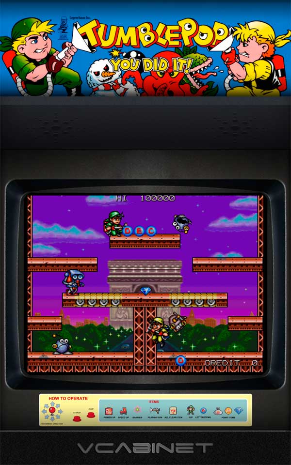 Platform game using backpack to suck up enemies. Once enemies have been sucked up they can be used as ammunition. Game set in different countries with five stages per country.