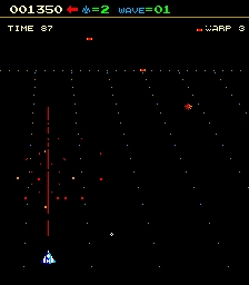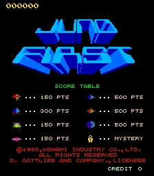 Juno First is a 1983 arcade video game developed by Konami and released by Gottlieb in the USA on September 1, 1983. Juno First presents a set number of enemies per level, but they do not make a gallery formation like Galaga or Space Invaders. Instead, the player's ship can move forward and backward (in addition to left and right) to hunt enemies in an orientation that is vertical, but has some horizon-oriented tilt. This style of gameplay would be re-used in a later Konami shooter, Axelay. The player destroys waves of enemies to finish levels. Starting formations vary from stage to stage. In addition, the player can pick up a humanoid, upon which the screen will have a red tint. While this happens, every enemy the player shoots will earn the player 200 more points than the previous enemy destroyed. The original score for shooting an enemy while in humanoid mode depends on the stage.