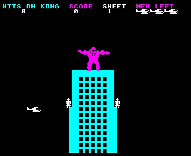 King Kong is a reasonably simple game. All you have to do is to use your helicopter to rescue the two girls perched on the side of the building, land them on the ground, and kill King Kong. When you have done that, you progress to the next attempt. You kill King Kong by hitting him 40 times with your machine guns. If you kill Kong before having rescued both girls from the building, the game ends. The game also ends if you crash into one of the girls. You lose a life if you are hit by one of the rocks which Kong throws down from his perch. You lose another if you crash into the skyscraper. To pick up one of the girls you simply position the helicopter just above her head. The BBC Micro will beep when you have done this. You land the girls by moving your helicopter to the screen bottom. Written by Chris Roberts and published in BBC Micro User April 1983.