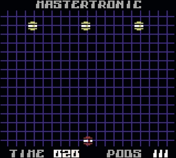 You play across an interconnecting grid of wire, along which your P.O.D (what else?) may be moved. The aliens arrive (usually) from the top and descend rapidly in orderly fashion, intent on causing P.O.D actual physical pain. You can't move over the damage until it heals (A few second), but the Bad Guys can move! Each level is timed (20 sec) as shown on the screen and to win through all you have to do is stay in one piece. Should you succeed a bonus extra life (every second level + 1 life - max. no.3) You will need them all! Firing will often be a problem because if the machine overheats, you can't shoot!