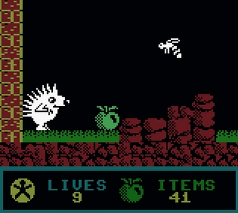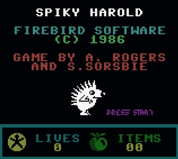 You must help Spiky Harold to prepare for hibernation. Each of the chambers beneath the Hedgerow contains an item of food which Harold can eat. However, he must avoid the creatures who will try to stop him. On his travels, Harold may find some coins which will give him extra lives, and wine glasses that will make him drunk (the creatures will be faster). When you have helped Harold to collect ALL the objects, he must be guided to his home cavern where he can hibernate.