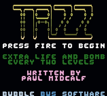 Welcome to Tazz, a game requiring skill and fast reactions. You are Tazz sent from a cowboy company 'Bug Exterminators Unlimited/Unreliable' and as your first day with this company you have been sent miniaturized into a computer to gate crash a wild party hosted by a real nasty bunch of bugs. All may look easy but it soon becomes obvious that those bugs have a slight personality clash with Tazz, and given half the chance will give him the touch of death should he ask them for their autograph. What's more these bugs have friends in the building trade and they just love building walls. Trouble is, they just don't know when to stop and often lose half their friends in the process. Now this party is wilder then you can imagine since some other party goers have turned up in really high spirits and are going round knocking the bugs flying all over the place and seem to have the same personality clash with Tazz as do the hopping happy bugs. Last I heard wild butterflies and razor sharp scythes were on the loose giving Tazz quite a bit of hassle...