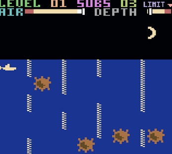 In Harbour Attack, you pilot a submarine through three stages to destroy an enemy cargo ship. Stage 1: Side-view navigation from left to right, avoiding mines and nets while managing air supply and depth. Going too deep, running out of air, or hitting obstacles costs a life. Stage 2: Another side-view stage where you surface to attack planes and ships, replenishing air while avoiding bombs, torpedoes, and depth charges. An octopus also appears on the C64 version. Stage 3: First-person view of the enemy harbour, where you guide a torpedo toward a cargo ship’s target while dodging moving barges. You must destroy the ship before your air runs out to complete the mission.