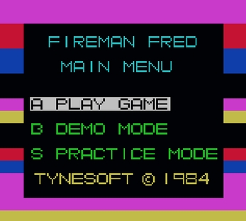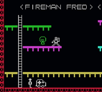 Fireman Fred is the hero of the Fire Service. Every day Fred leaves home for work at the Fire Station. When the fire bells ring, fearless Fred then swings into action with his ladders in an attempt to save lives from the perils. Fireman Fred gets many different calls for help, rescuing people and animals in danger at home and work. Fred must be very alert as there are many dangers around him - fires, balls of smoke, poisonous spiders, exploding light bulbs and bouncing balls, to name just a few. Your job is to guide Fireman Fred up the ladders and along the floors. To make his job harder, some floors have been burnt or broken away so Fred has to jump the gaps, and any other hazards that might get in his way. You must help Fred to rescue the people and the animals, get them down the ladders safely before sending them to hospital in the waiting ambulance. When you have succeeded on one screen you will go to the next until you have cleared all 20 screens.