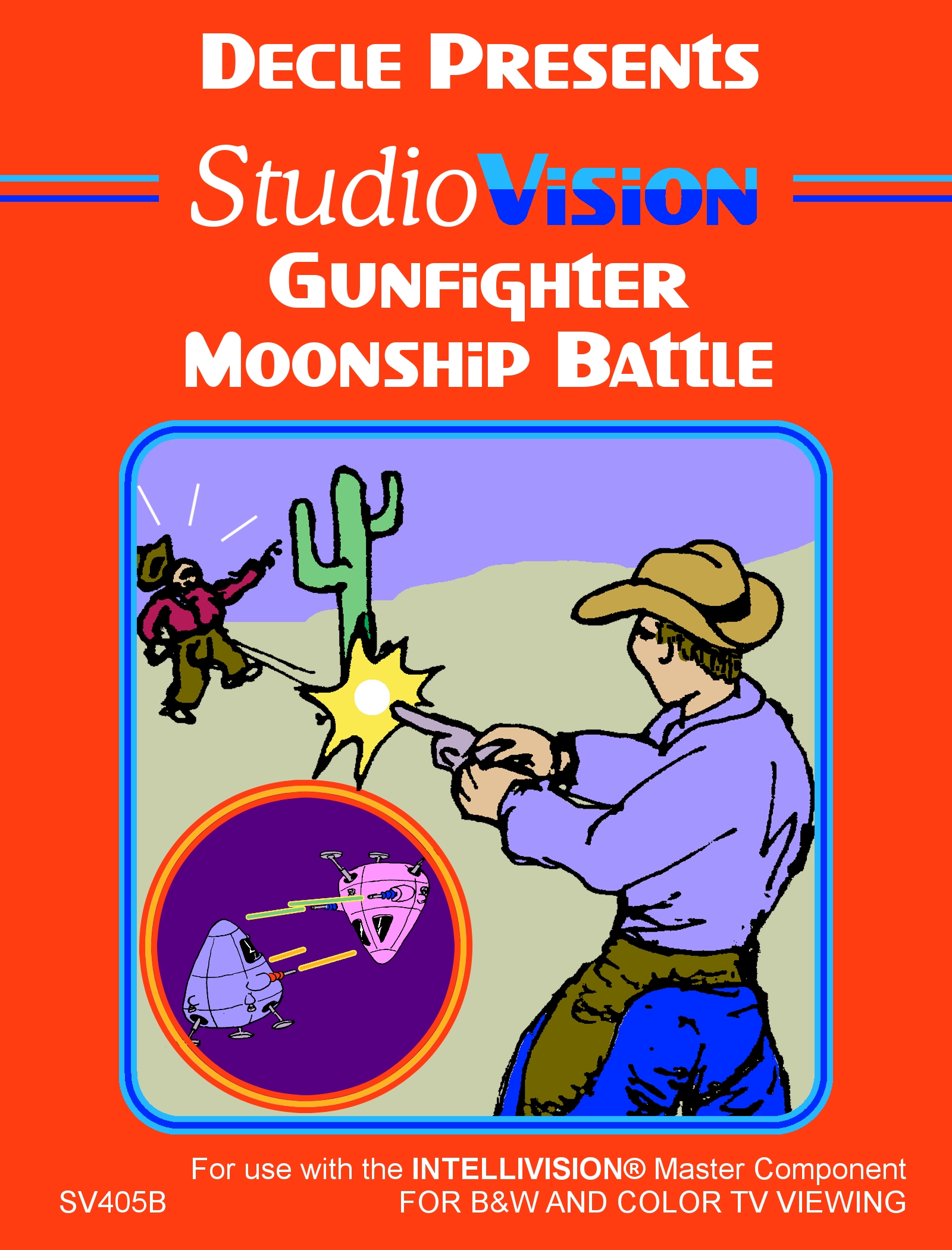 StudioVision is an emulator made to run RCA Studio II roms on the Intellivision game console to mark the 40th anniversary of the RCA Studio II console release. Several games were rereleased packaged with StudioVision. Gunfighter / Moonship Battle is a game cartridge for the RCA Studio II, a home video game console released in 1977. It includes two separate, simple action games. Gunfighter: Based on the popular 1975 arcade game Gun Fight. The game features two characters—either a player versus the computer or two players—that stand on opposite sides of the screen and shoot at one another. An indestructible obstacle, such as a cactus, stands in the middle of the screen. Moonship Battle: There are no obstacles, and characters are represented by simple, blocky "moonship" sprites. The gameplay involves moving and shooting at the opponent.