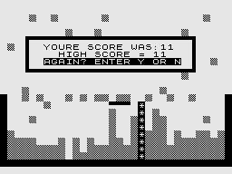 Brick-Stop has you controlling a bat close to the middle of the screen, moving it left or right. Blocks fall from the top of the screen and you must stop them falling with the bat to make a barrier of bricks. If you complete the barrier then the game will restart. Any blocks that pass the bat pile up on the bottom of the screen and if they reach the same level as the bat then it is game over. There are nine skill levels to choose from (1-9) and this dictates the amount of blocks that fall.