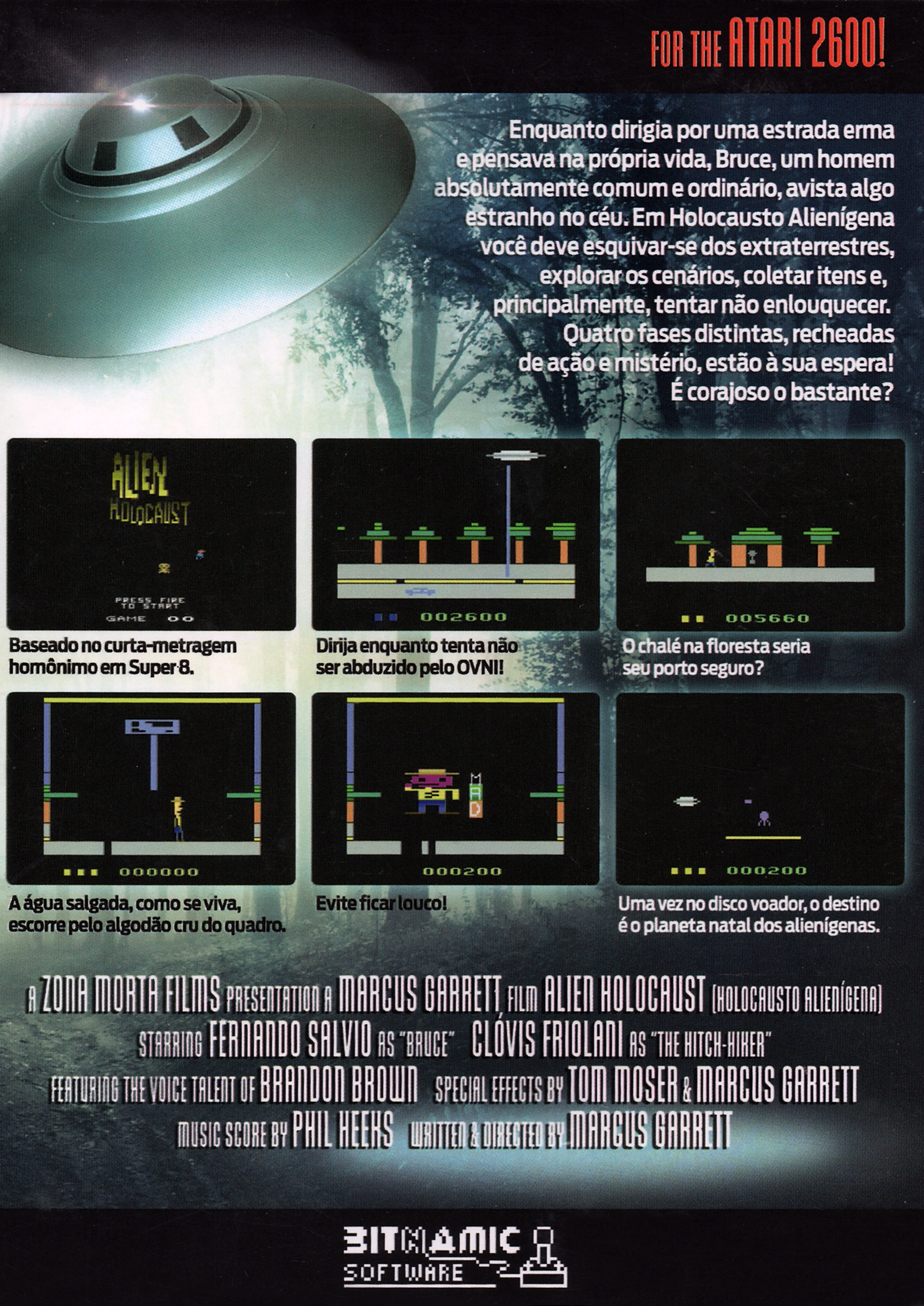 O ano é 1960. Bruce tem sua vidinha comum, seu emprego, sua familia.... Mas algo extraordinário está prestes a acontecer... Em Holocausto Alienígena você controla Bruce, que esta sendo perseguido por extraterrestres. São 4 fases distintas com jogabilidade diferente em cada. - The Road Bruce está voltando do trabalho na estrada escura quando avista uma luz no céu. O que seria esse brilho? - The Woods No ultimo instante, Bruce consegue pular do carro abduzido e cai na floresta. - The Cabin Uma vez dentro do chalé, Bruce achava que estava salvo, mas nem imaginava que coisas estranhas iriam começar a acontecer ali. - A Viagem o OVNI decola e leva Bruce abduzido para mais experimentos.
