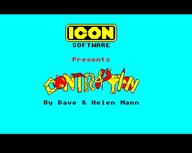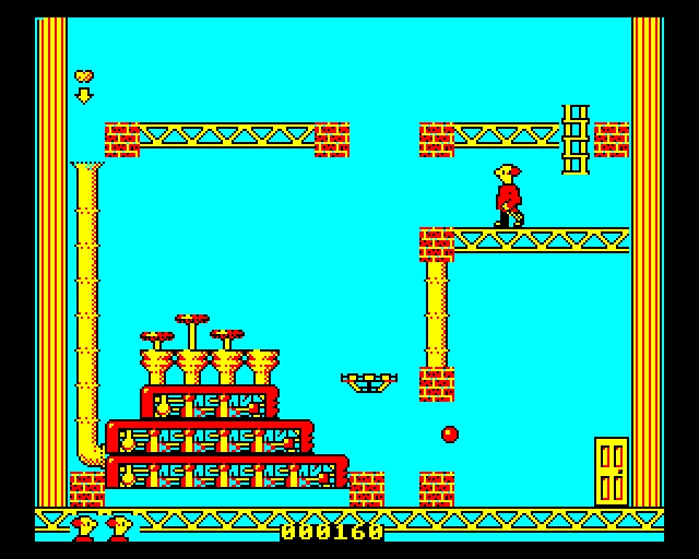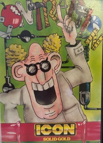 Contraption is a platform title where you control a crazy professor who is trying to collect golden apples to power his fabulous invention. It consists of ten single screen levels, each with its own distinct theme (under-water, frozen, hell, etc.) Every level contains four apples scattered about and guarded by a variety of enemies moving in regular patterns as well as some fixed dangerous objects. There are also moving platforms. The professor can die by touching something he shouldn't, or by falling too far. Once all apples have been collected, a door opens. The professor needs to collect all apples and escape from the level before a timer runs out. Otherwise, the level resets and he has to start over. After each level, there is a screen in which the professor needs to be moved to the top left, deposit his recently collected apples into his contraption, and then leave via the door to the next level.