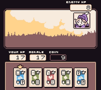 A turn-based stat-builder RPG where your attacks, defense, healing, currency, even level ups, all depend on choosing and playing cards from your hand. Balance combat effectiveness with saving powerful cards for training. Will you focus on healing or earning the currency to raise your maximum HP and Morale? You'll need both strategy and luck to overcome your enemies!