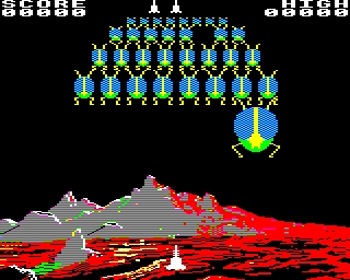 Attack on Alpha Centauri is a fixed screen shoot 'em up similar to Galaxian. Alpha Centauri is being attacked by enormous wasps. They swarm over the planet while dropping devastating bombs onto it. The player has to try and kill as many as he can before his inevitable death. The game plays like other shoot em 'ups of the early eighties. The player moves their spacecraft left and right along the bottom of the screen while shooting at the rows of wasps above them. The wasps start in stationary positions at the top but as time goes they take turns and move down towards the player and drop bombs. When all the wasps has been killed off they are replaced with a new and harder wave and the game goes on until the player has lost all their three lives. Points are given for each killed enemy. Stationary enemies are worth ten points while the flying ones are worth a hundred.