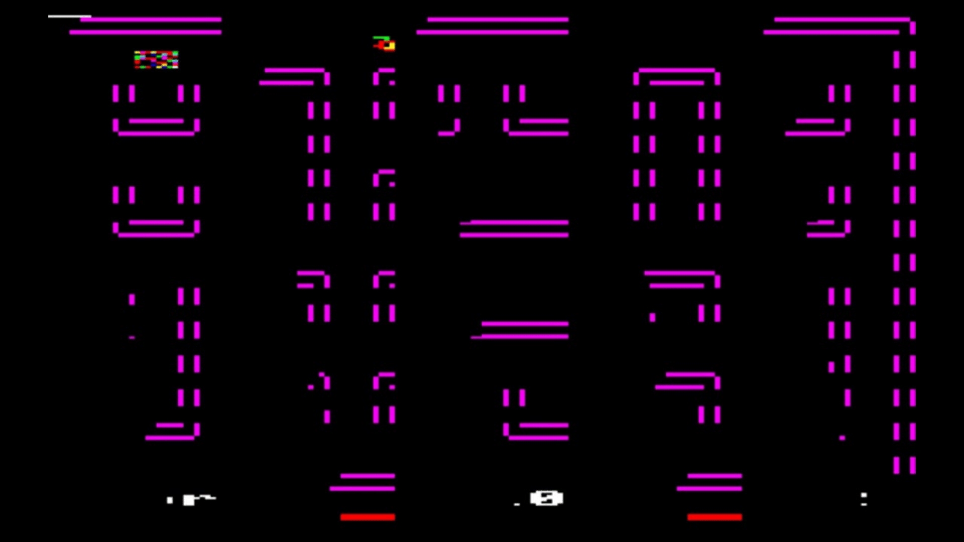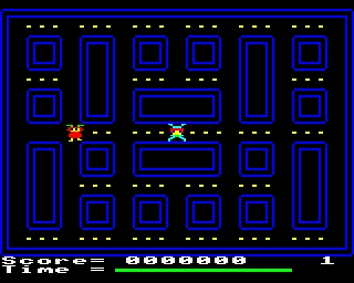 Atomic Protector is a fast-paced arcade title, like Pac-Man but in reverse. The player (a robot in charge of a uranium deposit invaded by aliens) this time has to protect already laid down dots on the map instead of picking them up. The enemies are of two kinds: One will run around the map, picking up all the dots. If all dots are taken, the game is over. If there are remaining dots when the time is out, the level is completed and the game progresses to a faster, more difficult level. In order to protect the dots, the player may bump into this enemy, sending it the other way, or he may set up a portable wall to seal off the enemy's path. The other kind is radioactive, and a staggering warning tone sounds as it enters the maze. It must be caught before it contaminates you. Each new level is faster, and more challenges are added.