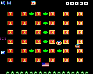 "The peace and tranquility of a small mid-west town in America is shattered by bands of rogue aliens (probably communists) invading the town and committing the ultimate sacrilage -- stealing the start from the national flag. Our wholesome hero who has been interrupted while eating his blueberry pie by this invasion, rushes for his tank and composes his forces. Wit your help, he must beat off the aliens and thus protect the America constitution."