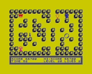 Bubble Trouble is an arcade maze style game in which the main goal is to collect all of the objects present in the scenario during a specific period of time. Each scenario corresponds to a different level. While collecting the objects, the player has to avoid contact with some moving big bubbles which will chase them when their presence is detected. If a collision occurs, one of the player's lives is wasted. The number of bubbles and the period of time a scenario has, both vary depending on the level of difficulty chosen before the game was started. By order of difficulty: Novice (one bubble / 60s); Intermediate (two bubbles / 90s); Expert (three bubbles / 120s). To complete a level, it's imperative to acquire at least all of the objects present in the scenario during the mentioned periods of time. Only then, the player can start accumulating points which will randomly appear in the maze in the form of collectable objects. These "objects" start to appear in a succession of pairs of 200, 500, 700 and 1000 points. After all the points in the double succession are picked up, a question mark shows up on a random point of the maze. If successively picked it will allow the player to immediately finish the level without having to wait for the rest of the necessary time to pass the level.