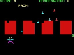 Poor Chico the Headbanger has to collect bags of money while avoiding a shower of hammers falling from the sky. Chico goes left and right to pick up the bags of money from the right side and stashes them at the left side of the screen. Direct hammer hits to the head raise Chico's pain meter, but hits to the arms and body are fatal. But even Chico can take too much and ten hits to the head result in a knockout. Blocks of protection are in between Chico and the hammers at the start of the level, each hammer hit eroding it in a similar way to Space Invaders, but only in reverse. Catching a falling aspirin tablet in the VIC20 version or a red hammer filled with aspirin in the Spectrum version will reset the headache and reduce the pain meter to zero. An aspirin collected while the pain meter is maxed out, will result in a hefty score bonus. The higher the pain meter is while returning the money, the higher the score will be for returning it.