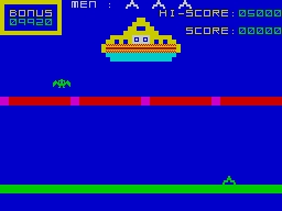 nvasion Force is a fixed screen shoot 'em up where the player, as so often before, has to defend the earth from an army of hostile aliens. The player moves his laser base along the bottom of the screen. At the top there's a large enemy ship that is protected by a moving force field. In addition to this there are smaller ships that drops bombs towards the player. The objective of each level is simply to destroy the large ship, but to be able to reach and damage it the player first has to shoot holes in the force field. Hitting the force field causes the missiles to ricochet back towards the player. The force field also has black parts that should be avoided, since hitting them will fully repair the enemy ship. To take down the enemy ship the player has to hit the control area located in the centre of the ship. The game is over when the player has lost all of his three ships or when the time runs out.