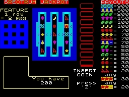 Jackpot is a fruit machine game that simulates the game-play of a fruit machine of the 1980's. It is fully featured for machines of that era with such features as hold, nudges, gamble nudges, gamble winnings and a feature box. The nudge and hold features of the simulation are explained in four detailed animated help screens at the start of the game. You start with an initial stake of 200 and each go costs 10p. Winnings, should there be any, can be collected or gambled. The game has fruit symbols, in colour and sound effects. Five symbols are shown per reel which is a great help when using the nudge feature (which allows nudges up as well as down). There is a nudge feature box and the number of nudges awarded, up to sixteen, depends upon which symbols in this box are lit. Once the game has loaded you press one button to put a coin into the machine, only one coin can be loaded at a time, and the simulation will tell you if you the hold feature is available. Once this has been dealt with, another key is used to start the simulation. The reels spin and when they stop you may, or more likely, may not have won. Occasionally nudges are available and action keys are used to nudge the reels up or down to try and get a winning line. That's all there is to the game. Repeat the above until all the money has gone. There is no auto nudge and there is no 'cash climb' feature; nothing else because back when this simulation was developed, such features were rare. More
