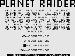 Planet Raider: A side view horizontal shooter with the screen scrolling left to right constantly, as you control a craft moving it up or down over a planet's surface. You must fly over a mountainous terrain, city and through caves bombing installations on the ground. Alien ships will fly towards you and these can be blasted with your laser. If you hit the surface, an alien or it's bullets then you lose one of three lives.
