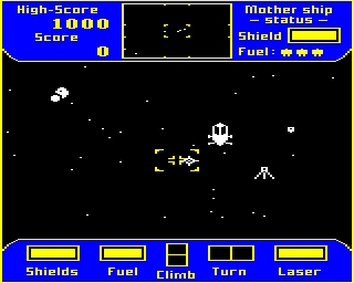 A 3D space battle. You are an interceptor pilot on board an earth supply ship, taking vital reinforcements to a beleagured planet. The Cylons have found out all about the mission and are determined to stop your ship at all costs. Aboard the mother ship is earth's latest weapon - if you succeed, it will drive the Cylons back to their planet.