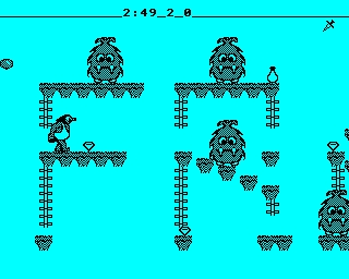 The Scrubblies and their friends have put all the special keys in hard-to-get places. Help Trogg collect all the keys, but watch out for the balloons and daggers! If you run out of time it becomes night-time. You can continue to play in the darkness, but you can't yo-yo balloons or daggers. There are a few things that Trogg can do that aren't obvious at first sight. If you hold the yo-yo key down, Trogg yo-yos further. If that still doesn't reach where you're trying to yo-yo, move a step or two closer (if you can) and try again. You will need to do this halfway across the first sheet and again later. Trogg can walk past one rope and catch the next one along or walk off a platform and grab hold of the rope beside it. This is useful at the start of the fourth sheet (hold the "Down" key down and walk right off the log-end). If you're having jumping across gaps, go to the top of the first bit on sheet one and practise up there. You'll have Trogg leaping around in no time at all! If you're wondering what everything does: bulbs give you more time before it goes dark, gems boost your score, and all the keys must be collected to finish each screen. Remember that Trogg has a big nose that helps get keys - although it often gets in the way! You start with three lives. Game Controls The game may be played from the keyboard or using a joystick (only First-Byte joysticks on the Electron). To start the game, press RETURN if using keyboard control or Fire if using a joystick. To use a First-Byte joystick, wait until the game has loaded, then press F until it bleeps. Z - Left, X - Right, * - Up/Jump, ? - Down, RETURN - Yo-yo S/Q - Sound/Quiet, N/M - Tune On/Off, COPY/DELETE - Pause On/Off ESCAPE - Quit Game