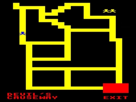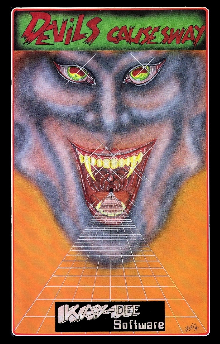 Devil's Causeway is a 1-player puzzle and guessing game for the BBC Micro. The player has been cast into Hell, and must travel along the Devil's Causeway to reach the exit. The player must use the cursor keys to move along the causeway without falling off. As they travel, a variety of mini-games appear that the player must correctly defeat or it's game over. Examples include: - Basil the Bomber: The player must choose from three boxes, one of which contains a bomb. - Bob's Blob: The player has 60 seconds to shoot a randomly moving Blob on the screen with a crosshair. - Colin Crusher: Guess the correct letter to defeat the crusher. - Donald the Demon Dice Thrower: The player throws two dice for a sum. The player must then guess if their throw will be higher or lower. - Lenny Lightning: The player stands in a field unmoving as lightning crashes down, hoping not to be hit. - Peter Password: A word is briefly flashed on the screen, and the player must correctly retype it. - Roger the Relocator: He randomly places the player on a different part of the causeway. - Sid Shape: A shape is briefly flashed on the screen, and the player must choose it from a list. - Simon Sumer: The player must quickly and correctly perform math functions.