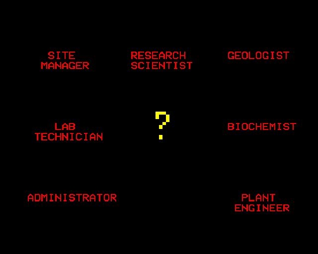 Classified information belonging to the MR Oil company is being leaked to a rival oil company. You take up employment with MR Oil in order to ferret out the mole. You can choose from seven job titles - Administrator, Biochemist, Geologist, Lab Technician, Plant Engineer, Research Scientist or Site Manager.