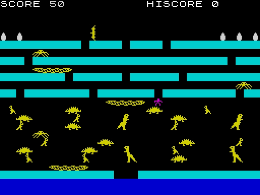 Caveman is a variant of the game Frogger where you play as a troglodyte in search of pterodactyl eggs. To reach the eggs at the top of the screen, you need to make it past streams of rampaging dinosaurs. Once you have reached an egg, you then need to make your way back home to the bottom of the screen, which earns you points. And then you have to do it all over again. Once all six eggs have been retrieved, the level ends and a new one starts with more tightly spaced and faster moving herds of dinosaurs. Game play continues until you lose all three of your lives.