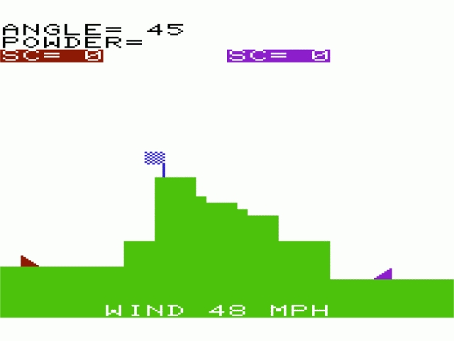 Each player controls a cannon on either side of the screen with a mountain in between. Players take turns setting the direction and power of their cannon fire to try to hit their opponent. Changing wind conditions lend challenge to the game. The game tracks score over several rounds