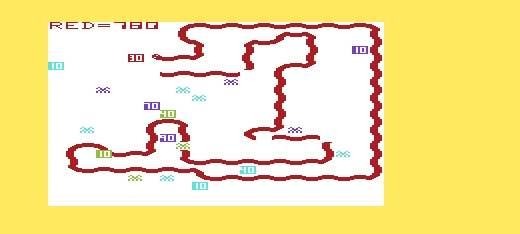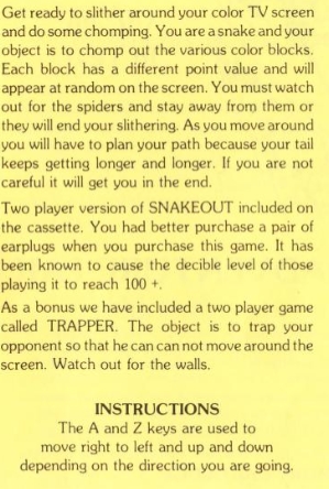 The player moves a snake with an increasingly elongating tail, while avoiding spiders and picking up bonus points. If the player hits a spider, the edge of the screen, or their own tail, it's game over. Simultaneous 2-player games for points, or a 2-player game where the goal is to trap the opponent is also available.