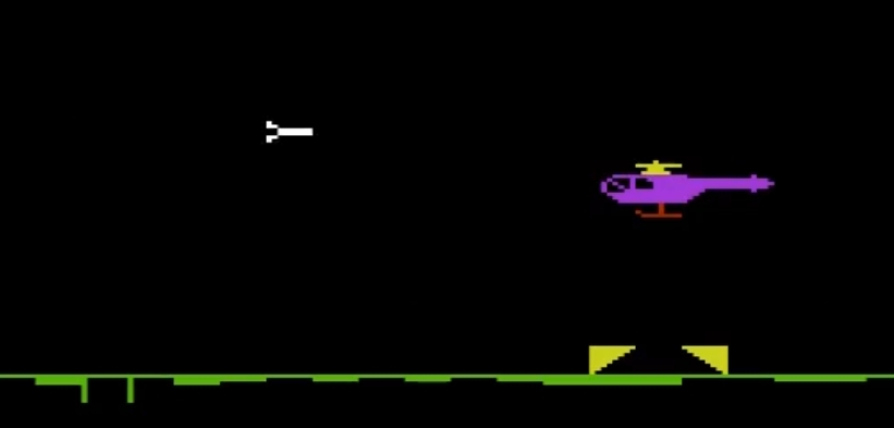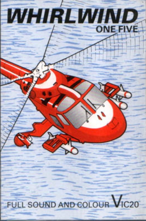 Whirlwind One Five is a 1-player arcade game for the VIC-20. Vital equipment is needed by your allies in order to stop the enemy missiles that are continually attacking your base. This equipment has to be loaded onto your helicopter in daylight and dropped over a target area. Game play is divided into 3 phases. In Phase 1, the player must take off and defend their fuel lines from enemy missiles. The player takes off from the landing pad, and can move in the cardinal directions to shoot down incoming missiles from the left. Each missile that passes by the player costs 20 fuel. If the player is hit by a missile it's game over. In Phase 2, the enemy begins to drop parachute mines directly onto your supply lines. The player controls a gun that moves laterally at the bottom of the screen. You must protect your helicopter's fueling by shooting the incoming mines. Each missed mine costs 5 fuel, and if all fuel is lost or the gun is hit by a mine it's game over. In Phase 3, the player must successfully make the cargo drop with their helicopter while defending from enemy missiles, and return safely to base.