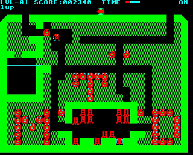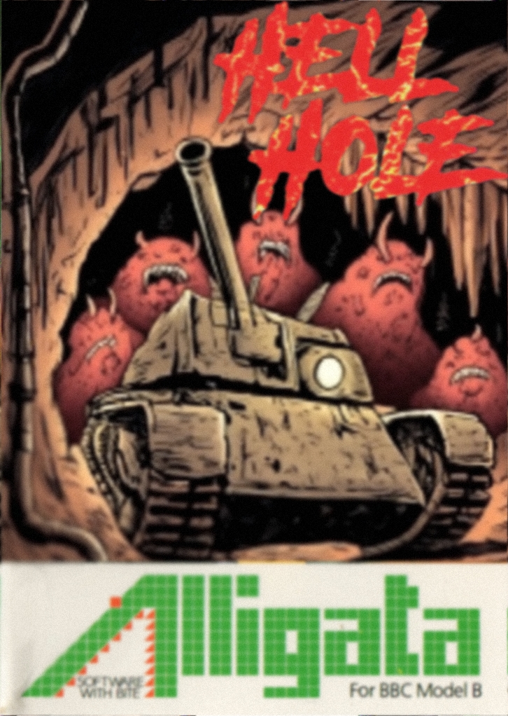 Hell Hole is an action/puzzle game about navigating a subterranean maze while avoiding hazards and collecting items. The player controls a tank that must tunnel through earth, avoid falling rocks, and collect crystals within a time limit. The player moves the tank through the maze, automatically digging through earth blocks. The maze contains rocks that can fall if unsupported, posing a threat to the tank. An alien enemy patrols pre-existing tunnels and will pursue the tank if their paths cross. The player must also avoid triggering airlocks, which can pull the tank into space. To complete a level, the player must collect crystals from a cave area, triggering falling stalactites, and return to the starting point.