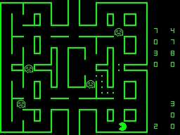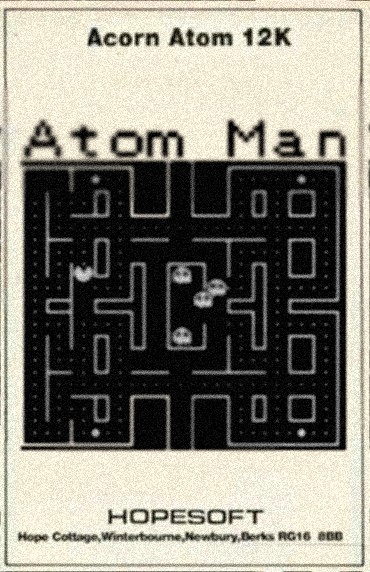 Atom Man is a Pac-Man clone that makes few changes to the arcade original. The player has to collect all the dots in the maze without being caught by the ghosts (or atom men as they are called here) that are chasing him. Some dots are larger and when collected the roles are reversed as they allow the player to go after and eat the ghosts. A level is completed when all dots have been collected. This version does not have any fruit. Instead there's a Hopesoft logo that can be picked up for a large points reward. The player has three lives and another one is given when 10,000 points have been scored. Before a game the player can choose one of three skill levels.