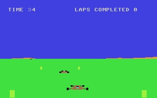 Published in COMPUTE!'s Gazette 1988/04 (Issue #58). The year is 1992. Since the days of the Stanley Steamer, engineers have been trying to create the ultimate automobile. Early this year, such a car was finally created, with durability, efficiency, control and SPEED. Cynics have doubts about the automobile's true performance, though, so the car must be entered in a race to demonstrate its technological superiority. A careful survey of the population has shown that you are the only person on the planet who can push this car to its limits, so you will drive in the big race. The race is held in a large, flat valley with a circular track marked by poles. At the top of the screen, you'll see displays for the time remaining for each lap and the number of laps completed. When the game begins, there are 46 seconds on the clock. With each lap, the timer is reset with three seconds less than the previous lap. The game's goal is to complete each lap in the time given and to travel as far as possible before time runs out.
