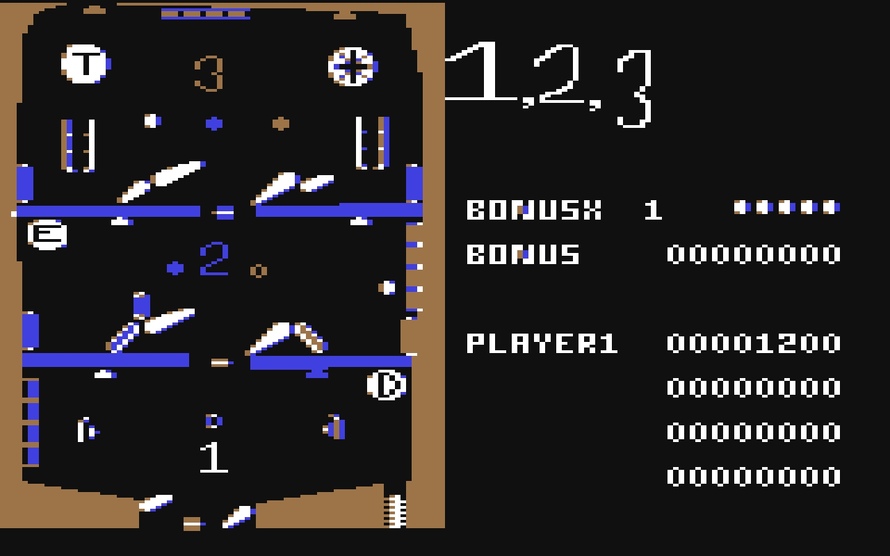 1, 2, 3 is a pinball game with three playfields one above the other. The ball can be sent into the next playfield and you attempt to keep it there using that playfields flippers. The higher playfields yield higher points.