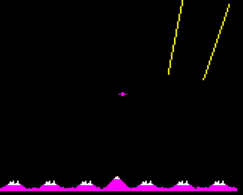 ABM Defend your seven cities against attack from wave after wave of random nuclear missiles. To destroy a missile you must position yourself on a suicidal intercept path and then wait for it to come into your sights. The only chance left then is to press your fire button. The laser power, refreshed from your capital city, is the protection that will save your universe from certain destruction. The higher your level of skill, the more demanding your mission becomes. Missile numbers increase and then split into multi war-heads until the inevitable happens and your capital city is destroyed by the final mushroom. Get straight back into your craft and see if you can hold out any longer in the next game.