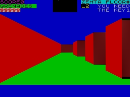 3-D Monster Chase is 1st person perspective maze game where the aim is to collect seven keys as well as defuse bombs while avoiding monsters. The maze is made up of three floors which can be moved between by lifts and each key must be found in order. Once you find key one you then have to take it back to your starting position which then places a bomb in the maze. The bomb needs to be defused in a period of time before it explodes or you lose one of three lives. Once the bomb has been defused then you must find key one again before you can find key two and this is the sequence the keys must be collected for all seven keys. As you search the maze, monsters start to appear and a monster keeps appearing after a period of time. If you are caught by a monster then a life is lost but you are armed with a limited amount of grenades to throw.