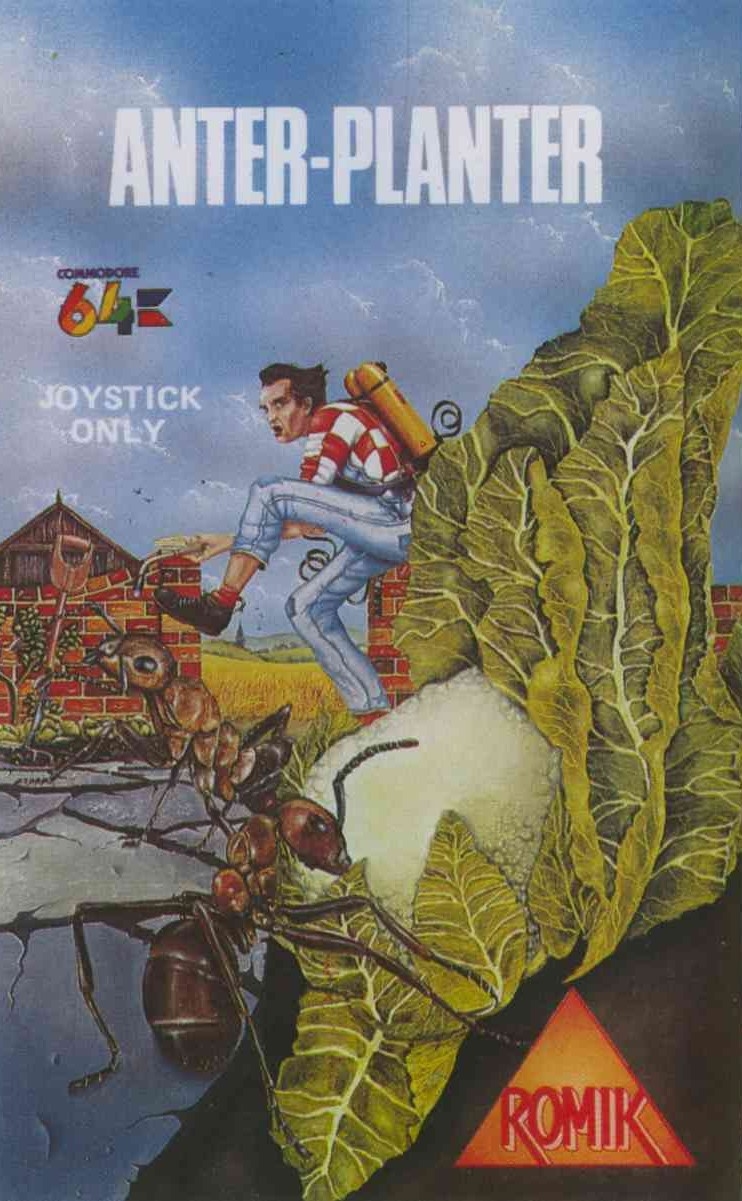 You are Pete and there you are happily watering your plants in your vegetable garden when your garden is invaded by a plague of ants, hellbent on eating everything your garden grows over various levels. Armed with a high-pressure hose fed from a back-pack your only hope is to drown the ants and seeing as it is also a hot day you have to keep the plants watered as well before they die. Anter-Planter is a single screen game where you must move around the garden with three plots, hitting as many ants as you can with your hose as a timer counts down. As the plants get smaller you must also hit them with water to make them grow big again and if they get too small then they disappear. Your back-pack can only hold so much water and when it is empty then you must go into the greenhouse to fill it. Once the timer reaches zero, you must have at least one plant in each plot to move to a bonus game, if you don't then it is game over. The bonus game is also single screen and this time you are in the ant-hill and you must kill as many ants moving around a maze, before another timer counts down. Once the bonus game has been played then you move to the next level with more faster ants appearing. There are three speeds to choose from and they are slow, medium and fast.