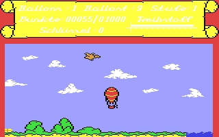 Fly a hot air balloon around for as long as you can without running into obstacles such as birds. Developed by Tino Lanari and published in Compute mit 1987/09.