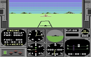 Acrojet contains ten acrobatic events which can be played by up to four players and at four different levels of difficulty. In all ten events you fly a BD5J Acrojet over a series of obstacles: In the Pylon Race you have to fly around pylons and land safely. In the Slalom Race you have to fly a 'figure 8'. In the next event, the Ribbon Cut you have to break two ribbons. In the Inverted Ribbon Cut you perform the same stunt but flying the plane upside down. In the Ribbon Roll there are two ribbons in a row and you have to fly under one and complete a full roll followed by flying under the second ribbon. In the Under Ribbon Race you perform a slalom by flying in sequence under three ribbons. In the Under Ribbon Loop you fly under a ribbon followed by a loop and passing over the same ribbon upside down. In the Spot Landing event you have to fly up to 2,000 feet and land on the runway as close as possible to a marked spot. In the Flame-Out Landing event you perform the same stunt but then without the engines running. The tenth and last event, the Cuban Eight, you have to make a half-loop over a ribbon, followed by a half-role, a half loop and flying under the first ribbon again. Some game parameters can be set. You can decide how the weather conditions are going to be. An instrument panel at the bottom of the screen contains several readouts, like an altitude meter, a compass, an artificial horizon and a vertical velocity meter.