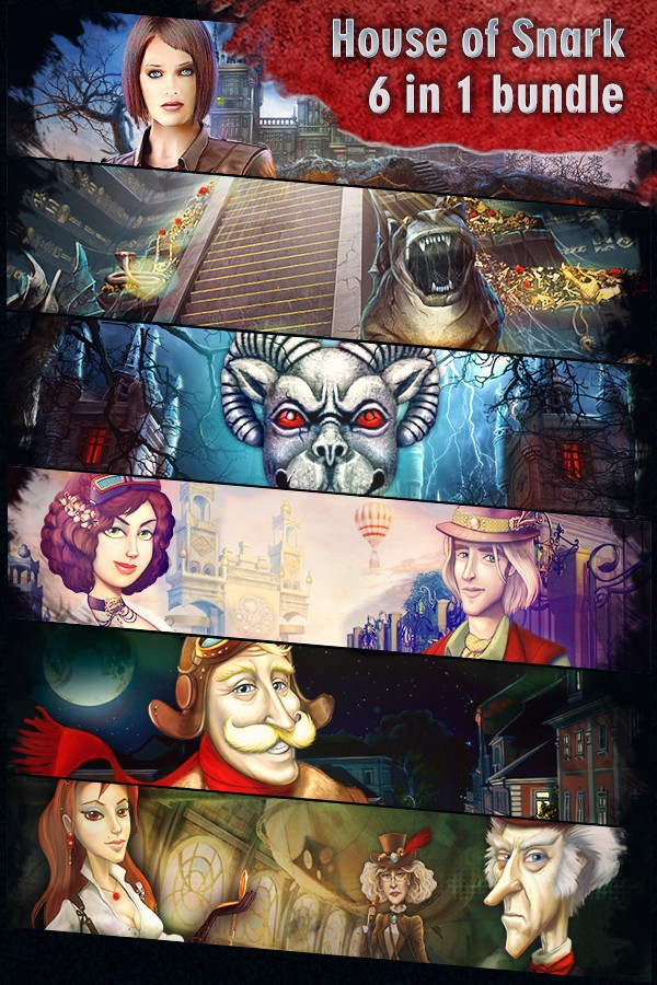 This is a huge collection of games that includes 3 Collector's Editions and 3 steampunk games! Snark Busters: Welcome to the Club Do you have what it takes to find the Snark, an elusive creature few people have seen and no one has caught? Are you brave enough to follow it through mirrors and into inside-out and upside-down worlds? Can you decipher the clues, solve the puzzles, and piece together the objects you need to track down your target? Join Kira Robertson as she escapes her father's overprotective clutches and sets out to earn a place in the elite Snark Busters Club! Snark Busters: High Society Investigate the dastardly deeds of a wealthy socialite and prove your fiance is not a thief in Snark Busters: High Society! Love, envy, and revenge join forces to make the hunt for the Snark more exciting than ever in this all-new hidden object adventure! The day after world famous photographer Elizabeth Hughes announces her engagement to a handsome gardener named Nicolas Fortright, the wealthy Duchess Daffington accuses the young man of stealing a precious family heirloom. With her beloved behind bars, Elizabeth sets off to learn the truth. Solve riddles that reveal pieces of the larger puzzle; follow the trail of clues through mirrors and into the backward world, where the Snark remains as elusive as ever; and chat with charming ghosts, each of which has a quest for you to solve. Stylish steampunk visuals bring the world of the Snark to stunning life, while the professionally voiced characters deliver a spellbinding story of humor and suspense. Can you catch the Snark? You're closer than ever! Snark Busters: All Revved Up Snark Busters 2: All Revved Up tells the incredible story of Jack Blair, a world-famous racecar driver who puts his career on hold to catch the Snark. Join Jack as he jumps between the real world and the inverted realms inside of mirrors in an attempt to catch his quarry. Solve dozens of whimsical puzzles; explore worlds of exquisite detail, and keep your eyes peeled for hundreds of cleverly hidden objects! Packed with mini-games, animated cinematics, and clickable surprises, Snark Busters 2 offers a ride you'll never forget! House of 1000 Doors: Family Secrets Collector's Edition Welcome to the first game in a stunning new saga! When the dead cannot find release, the House of 1000 Doors serves as a portal that allows the living to help them. But as the House appears at locations around the world, it doesn't let just anyone in. To step beyond its threshold, a person must be able to communicate with spirits. The protagonist of this spectacular new series of hidden object adventure games is Kate Reed, a washed-up writer of ghost stories who wonders if she'll ever experience success again. Guide Kate as she responds to an invitation to enter the House, meets the mysterious Lancaster family that resides within it and solves four mind-bending mysteries that take her to worlds she's never imagined. House of 1000 Doors: Palm of Zoroaster Collector's Edition A cursed gem that has left a trail of smoldering bodies in its wake is threatening the residents of the House of 1,000 Doors, prompting the head of the mystical dwelling, Gabriel, to once again summon Kate Reed to its aid. Guide Kate as she searches Tibet, Jerusalem, Madagascar, and more for the artifacts that can break the power of the gem, solve a massive array of cleverly designed puzzles and find hundreds of ingeniously hidden objects. Production values that rival the quality of theatrically released animated 3D films and superbly performed voiceovers will draw you into this story of supernatural intrigue, unbounded adventure, and sweeping scope. The House needs you. Will you answer its call? The Collector's Edition of House of 1,000 Doors The Palm of Zoroaster comes with concept art, dazzling desktop wallpapers, a step-by-step walkthrough, and a captivating bonus chapter that lays bare the mysterious past of Gabriel. House of 1000 Doors: Serpent Flame Collector's Edition Return to the House of 1,000 Doors to save mankind from annihilation! Giant snakes have burst out of the Earth and are wreaking destruction across every continent. From the smoking rubble of a ruined city, the House rises to the clouds, and a mysterious stranger rescues Kate from certain death and brings her to the strange dwelling. Her mission: to travel back in time to four different epochs to gather the elements needed to activate a machine that can destroy the ancient beasts. Your journey as you guide Kate will challenge you. As you scour each jaw-dropping location for the items you need, you will face a terrifying serpent god, save a medieval girl from a mad inquisitor, and stop the plans of an evil Roman emperor. You'll also search for hidden objects, solve mind-bending puzzles, and beat clever mini-games as a story of remarkable imagination unfolds with each step forward. The House serves as a portal to many adventures - and this is one of its greatest. Do you have the courage to step through the door? The Collector's Edition of House of 1,000 Doors: Serpent Flame features a thrilling bonus chapter, desktop wallpapers, concept art, and a step-by-step walkthrough.