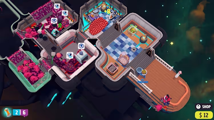 Out of Space is a LOCAL and ONLINE co-op multiplayer game about living together in a house in space. You and your friends are about to move into a house in space, where you will have to deal with a deadly alien infestation and face the challenges of building a sustainable spaceship, all to make your new place feel as cozy as home! Each match starts in a procedurally generated spaceship house that will demand your best planning and teamwork skills to become clean and comfy. You and your friends will need to generate resources, recycle trash and alien goo, buy and build new technologies, and take care of one another, if you ever want to call home the mess that you got into. As a COUCH-FUN game, Out of Space has short matches and is easy for everyone to grab a controller and play. At the same time also as a STRATEGY game, it will require short and long-term decisions, expanding and conquering new rooms and building technology to automate tasks.