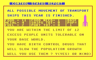 Having been elected Controller of a frontier colony on a planet the far reaches of the galaxy, you now have the difficult job of efficiently managing the planet and its surrounding system. Under you direction, spacecraft will explore the galaxy seeking new worlds for the ever expanding population, while in the colony, despite scientific researches, the planet become increasingly dependent on imported resources and the skill of your management.