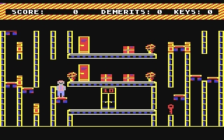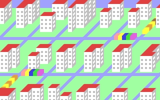 Simplistic and original early idea from Andromeda Software, of Scarabaeus fame. Set the city free of the wicked magic by recoloring the houses of the citizens! With this aim, generate the required code on your color or digit train by successive crashings. At each crash, the involved colors and digits interchange. Move your train by horizontal joystick action. Fire during motion for increased speed. In senior version, you can change rail at hidden crossings by vertical joystick action during motion. Push the rod while your train is at rest and your colors or digits roll to the left. Fire without joystick action for reverse order of colors or digits.