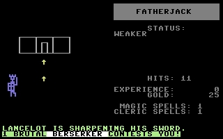 Kormath has stolen The Holy Grail and Excalibur from Merlin and Merlin has promised a great reward for anyone who can go to Kormath's dungeon underneath The Standing Stones and retrieve his items. You are a Knight and you have decided to go dungeon exploring and treasure hunting for Merlin. Lancelot will come along but can only help occasionally. The Standing Stones is a 3D maze game with small elements of RPG and has you viewing the dungeon and surrounding areas from a 1st person perspective. Before you start your exploration you are given random values to five traits, Virility, Intellect, Holiness, Agility and Initial Hits. If you don't like these values then you can get another set of random values. After entering your name it's time to start your adventure. Using the keyboard you can move around the dungeon in stages and turn 90 degrees. You will encounter treasure and chests and these can be opened, ignored or opened carefully. Scattered around the dungeon are Kormath's minions and you can either bribe, greet or fight them if you can't evade them. Combat is just random with no skill, just luck on your side. Lancelot will appear occasionally to aid you. You are able to use magic and potions and these are also scattered around the dungeon to be found and you can rest and drop objects you don't require. You only have one life but you have the ability to save your game. The Dungeon Master option is just Disk cleaning