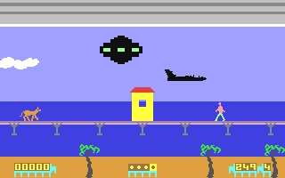 Kami-Kaze Kami-Kaze is a side view single screen shooter where you control a battle-cruiser of the Xenon Fleet at the top of the screen as you stun humans and dogs below with your weapon below to stop them destroying battle plans. This was because one of the cruisers, Argon was forced to land on Earth and on the pier in Cleethorpes, England. The cruiser was equipped with psycho-visual shields, which prevents other races from seeing the ships and see something more familiar instead. The cruiser has made itself look like toilets, and so the humans are walking to the cruiser from either side of the screen to use it. To make matters worse, the battle plans for the fleet have also changed and now look like toilet paper which the humans are using. Dogs in the local area are starting to copy famous toilet paper adverts by grabbing the plans and taking them back to the edge of the screen. You have to keep the humans from entering the cruiser by moving around the screen, but if you shoot a dog with paper, then the RSPCA send a helicopter to shoot you. Your cruiser is a delicate machine and if you are hit by the helicopter or touch other items like the pier, the cruiser you are protecting, or a cloud then you lose one of five lives. Jet-planes also make an appearance and must be shot or avoided. A life is also lost if the plans are completely destroyed,